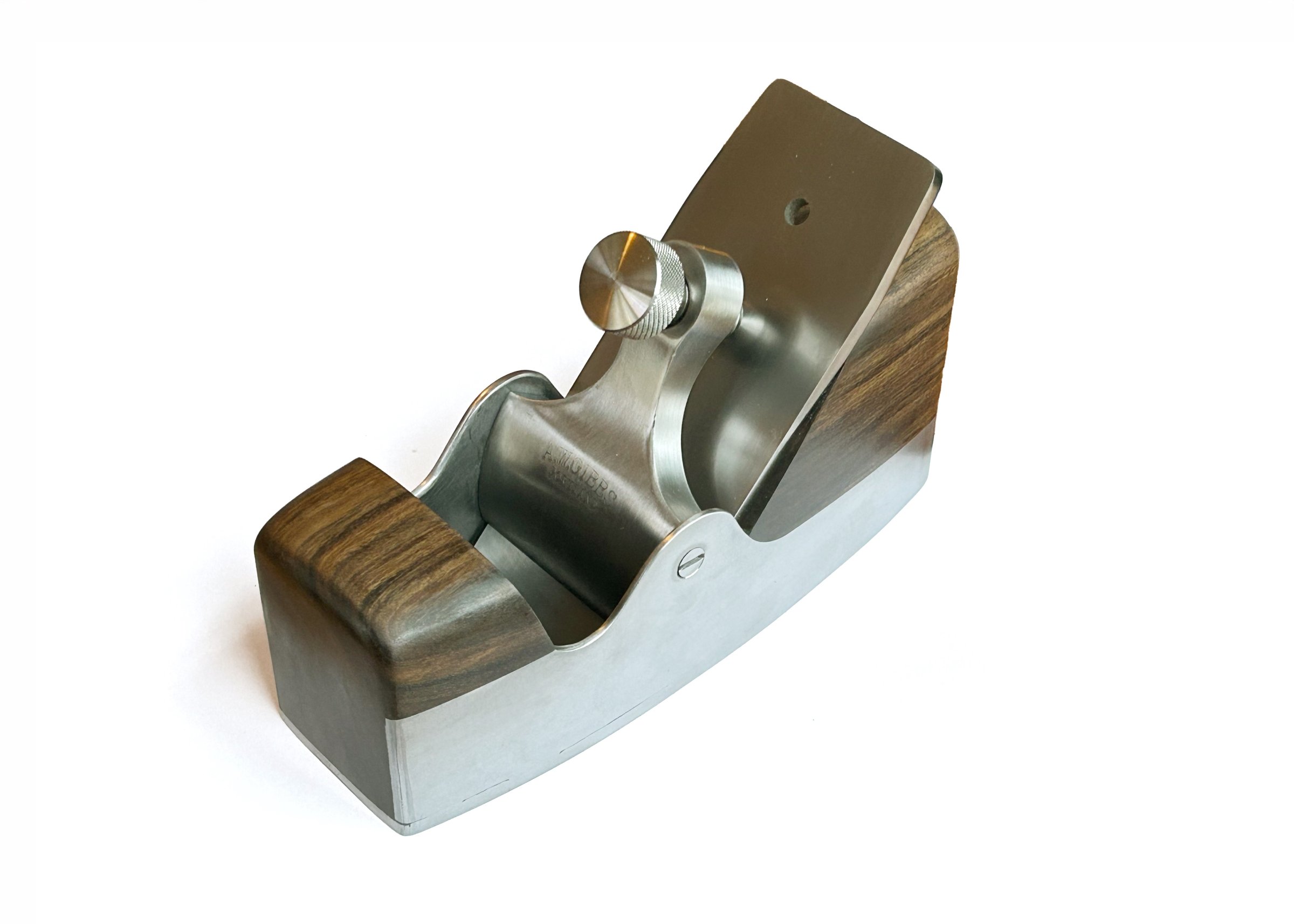 This was my first effort at a curved-side infill smoothing plane. It is modeled closely on an old Spiers infill smoother in my collection. Many hours went into closely measuring the plane and modeling the metal parts in CAD so I could outsource rough cutting of the metal to a laser to jump start my process. Some modifications were made intentionally: the lever cap pin is removable (and thus has visible screw heads instead a pin peened flush) and I used a single 3/16" O1 iron rather than the double-iron arrangement on the original. Many other deviations I'm sure were introduced unintentionally.