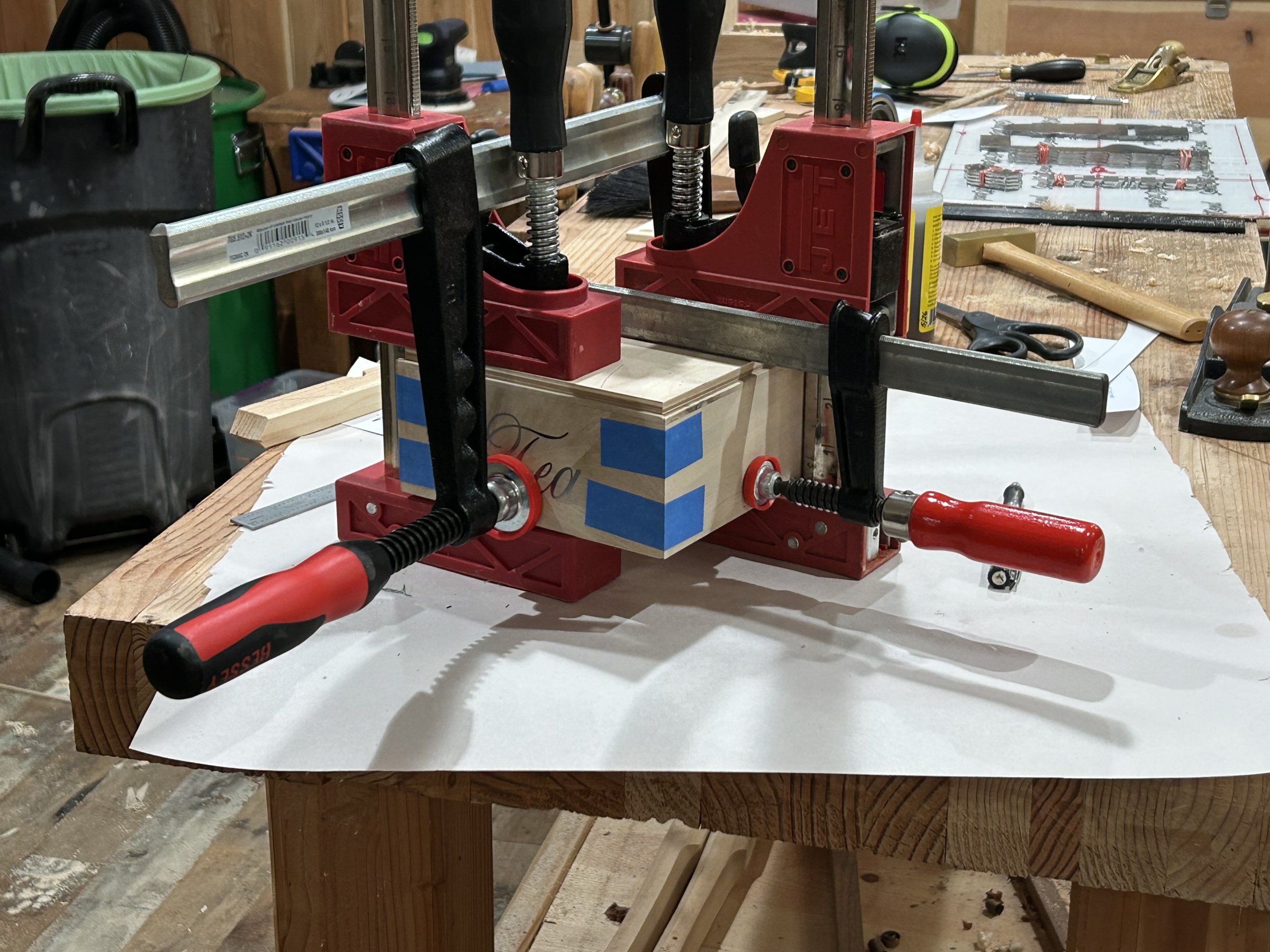 Futz with fit on miters; recut base; veneer base. I always forget how much I dislike miters.