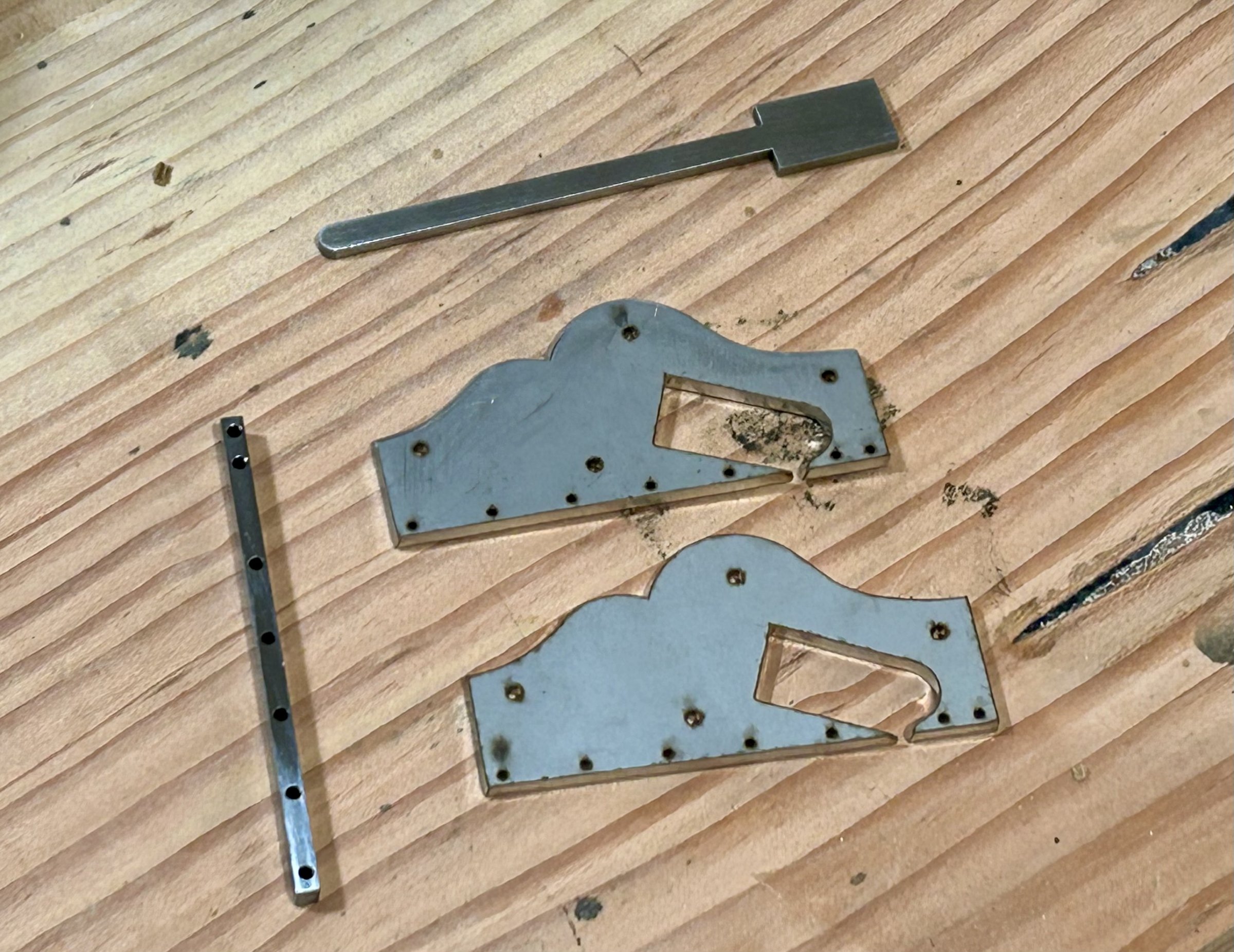 Parts cut to my design.Rough assembly of the parts This is a second version of the tiny infill rabbet plane I made in 260 brass and O1 steel last month. The sole and sides are 304 stainless steel this time. As a result, I'm using a pinned construction rather than a dovetailed construction. Given my current anemic milling set up, I had the holes in the sides roughed in at the same time I had the sides cut, and the sole was milled with roughed holes to my design. I'm perhaps naively optimistic that I'll be able to drill and ream these rough holes to final size on the Unimat.