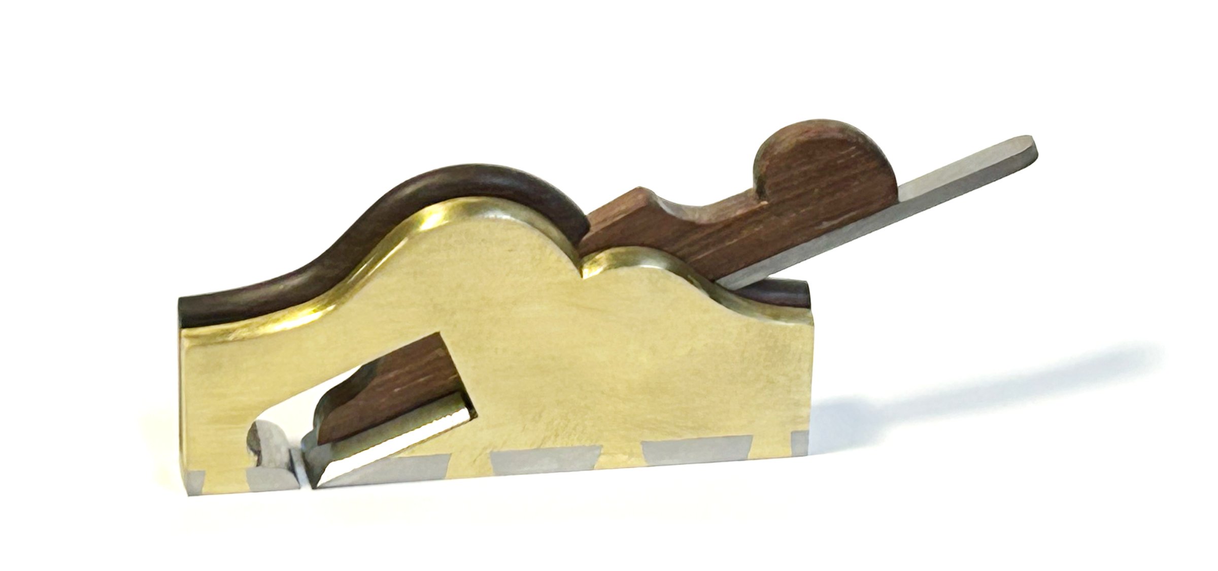 Mini infill rabbet plane with dovetailed brass/steel and rosewood infill. Created as an exercise in replicating a particular antique plane. The original had a cast shell; this one is dovetailed. Other than that, and the choice of metal for the sides of this iteration, it is as dimensionally close to the original as could be achieved.