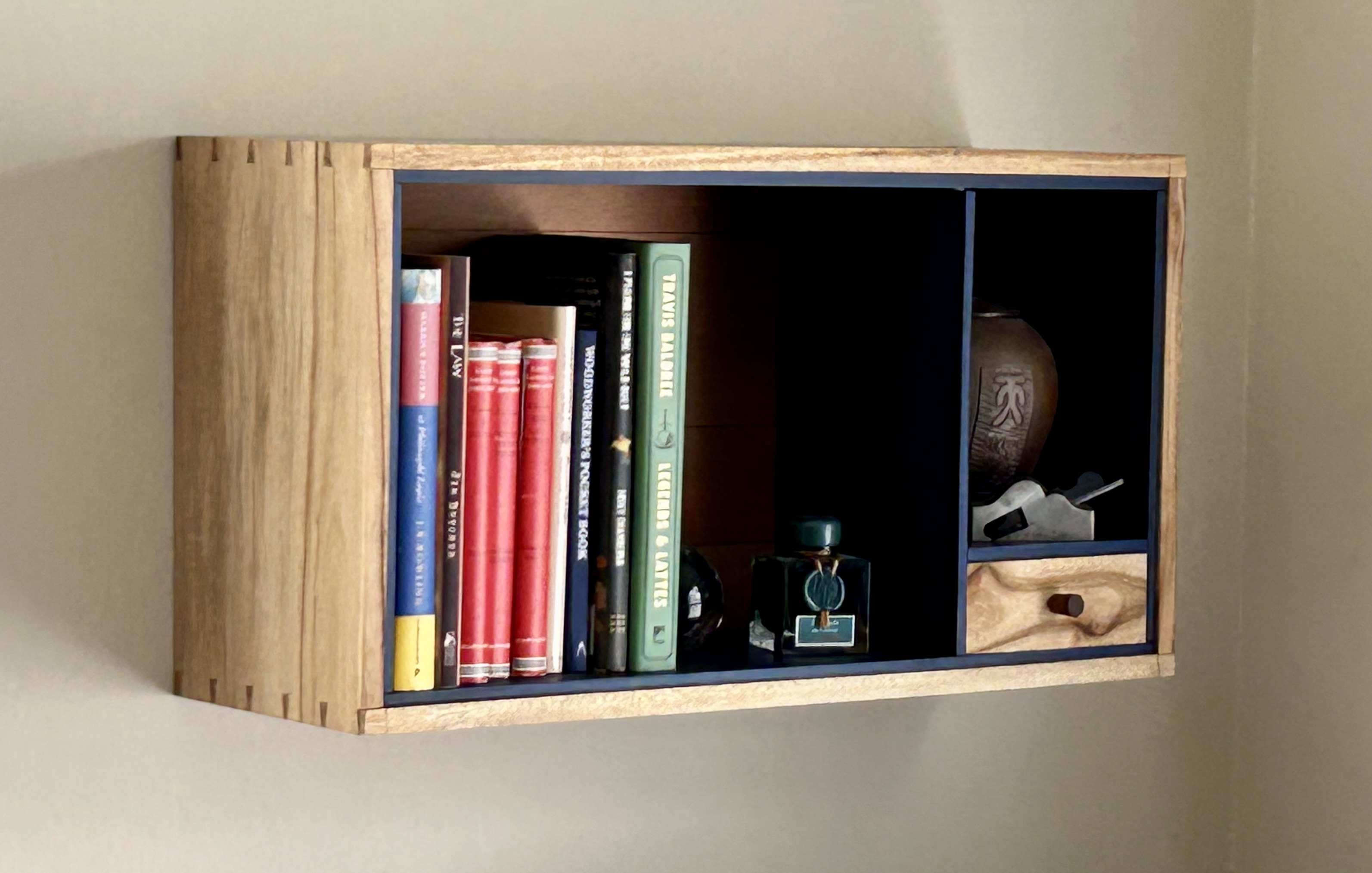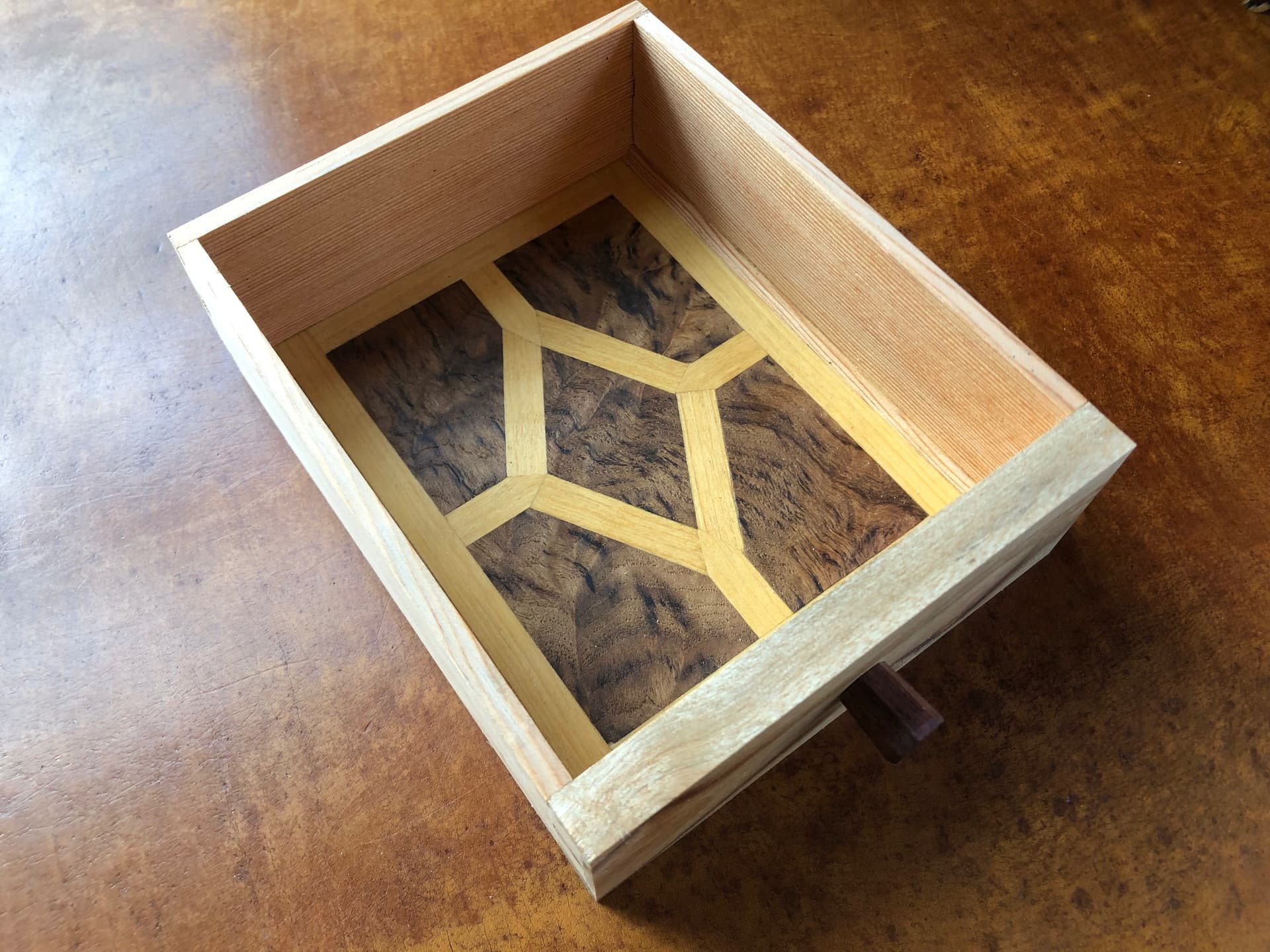 The carcass is camphor with a lining of blue-painted pine. Secondary wood, including the back panelling, is VG fir. The parquetry on the drawer bottom is satinwood and walnut burl. Inspired by a Matt Kinney design.