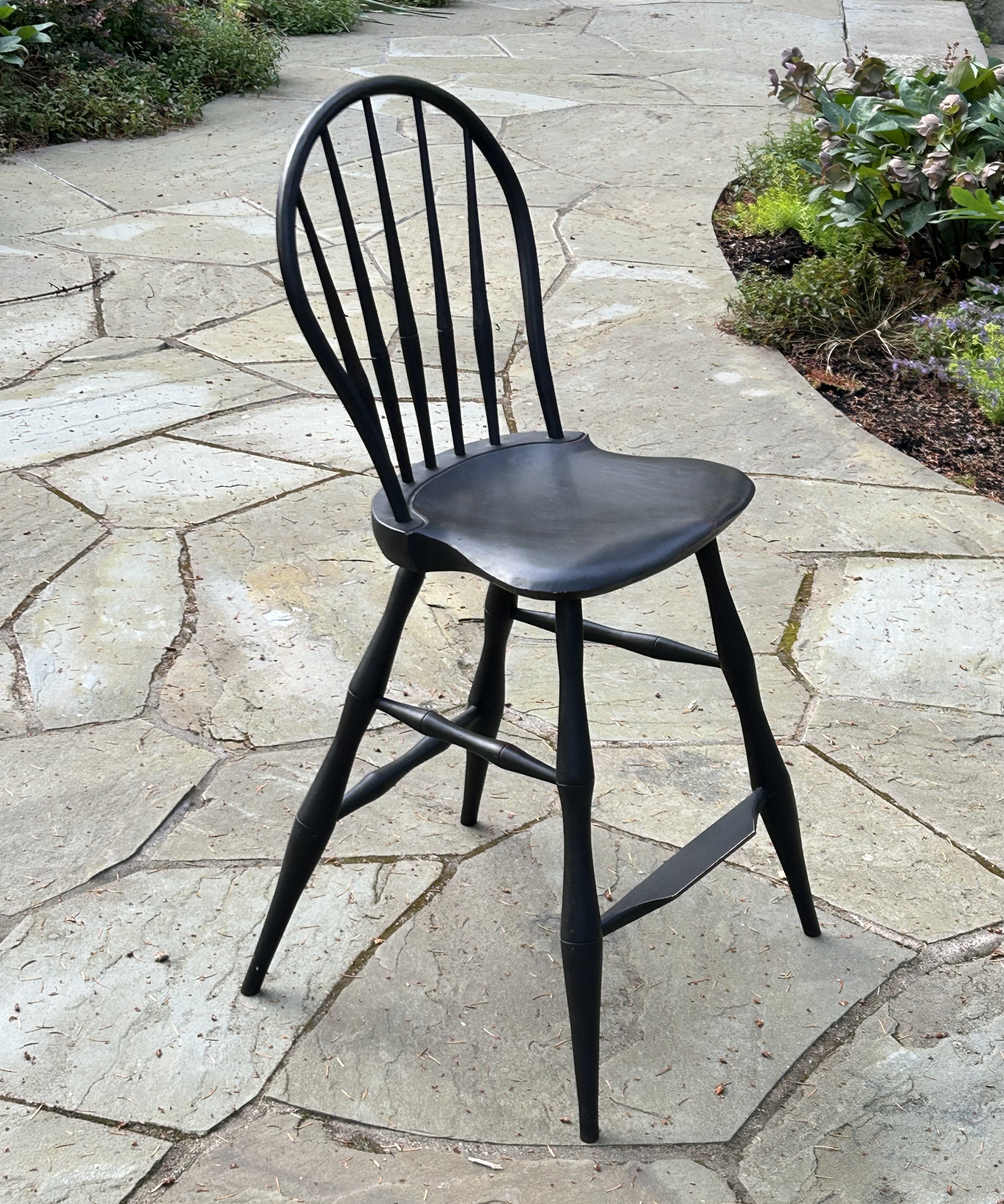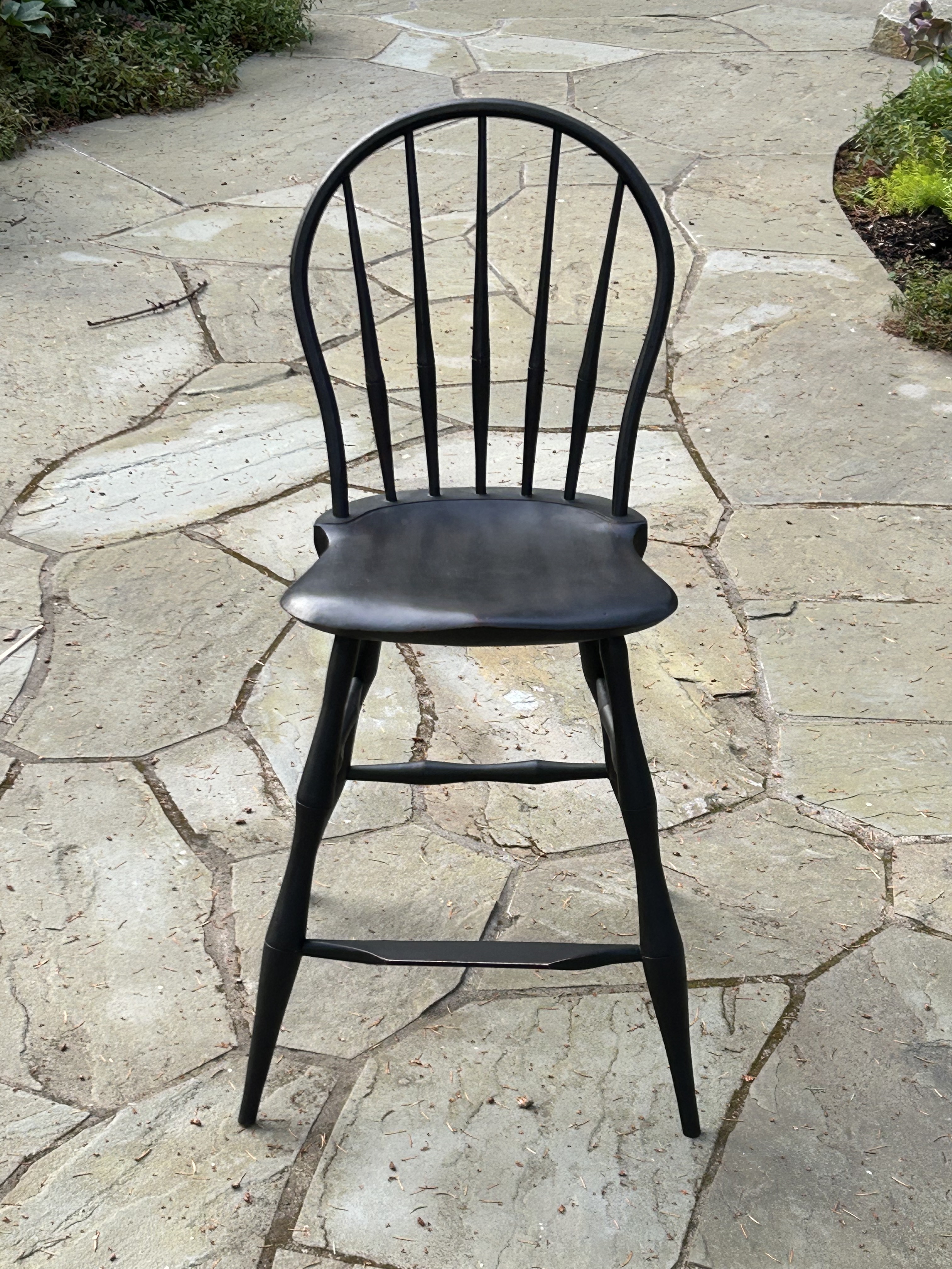 Design by Peter Galbert. Pine (seat), oak (bow and spindles), and maple (legs and stretchers) with a black over red milk paint finish (very heavy on the black this time.)