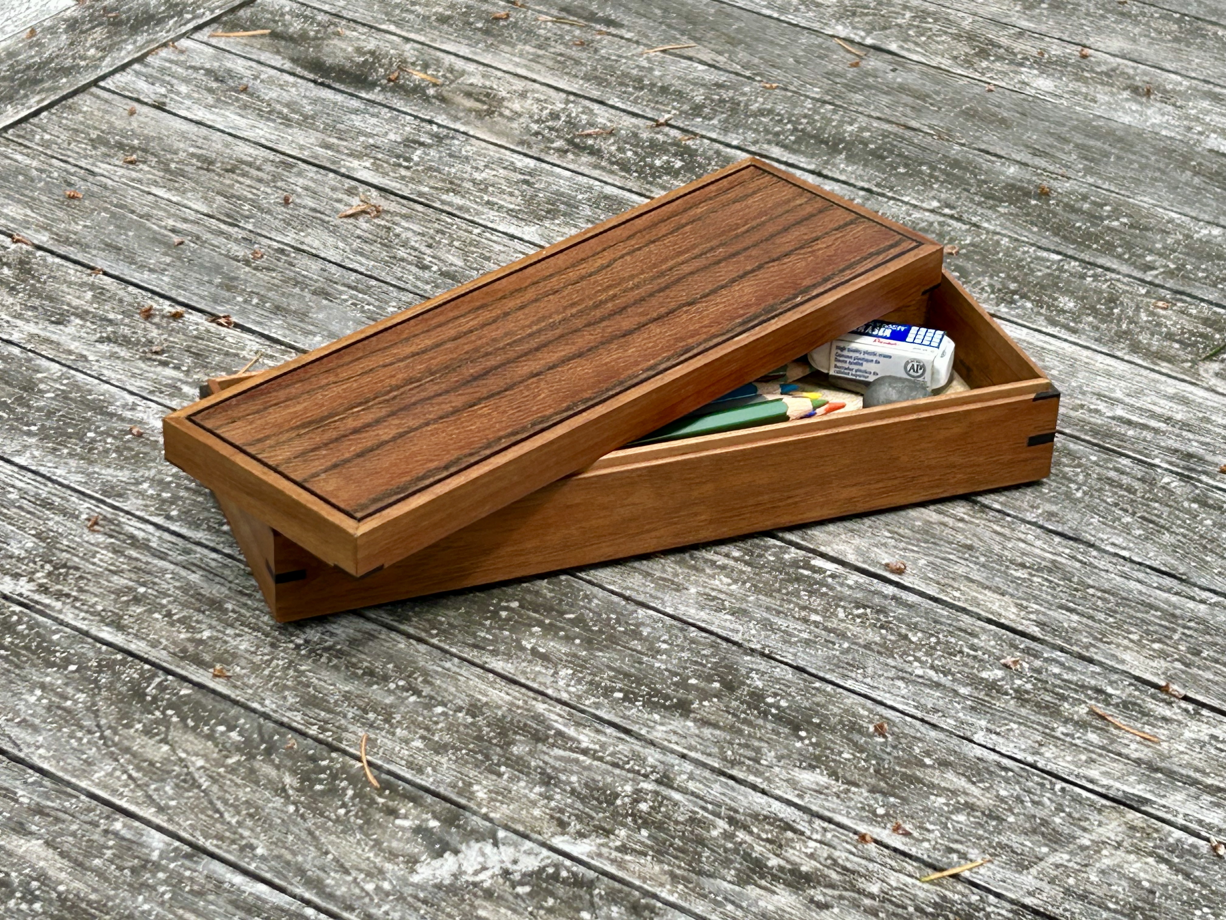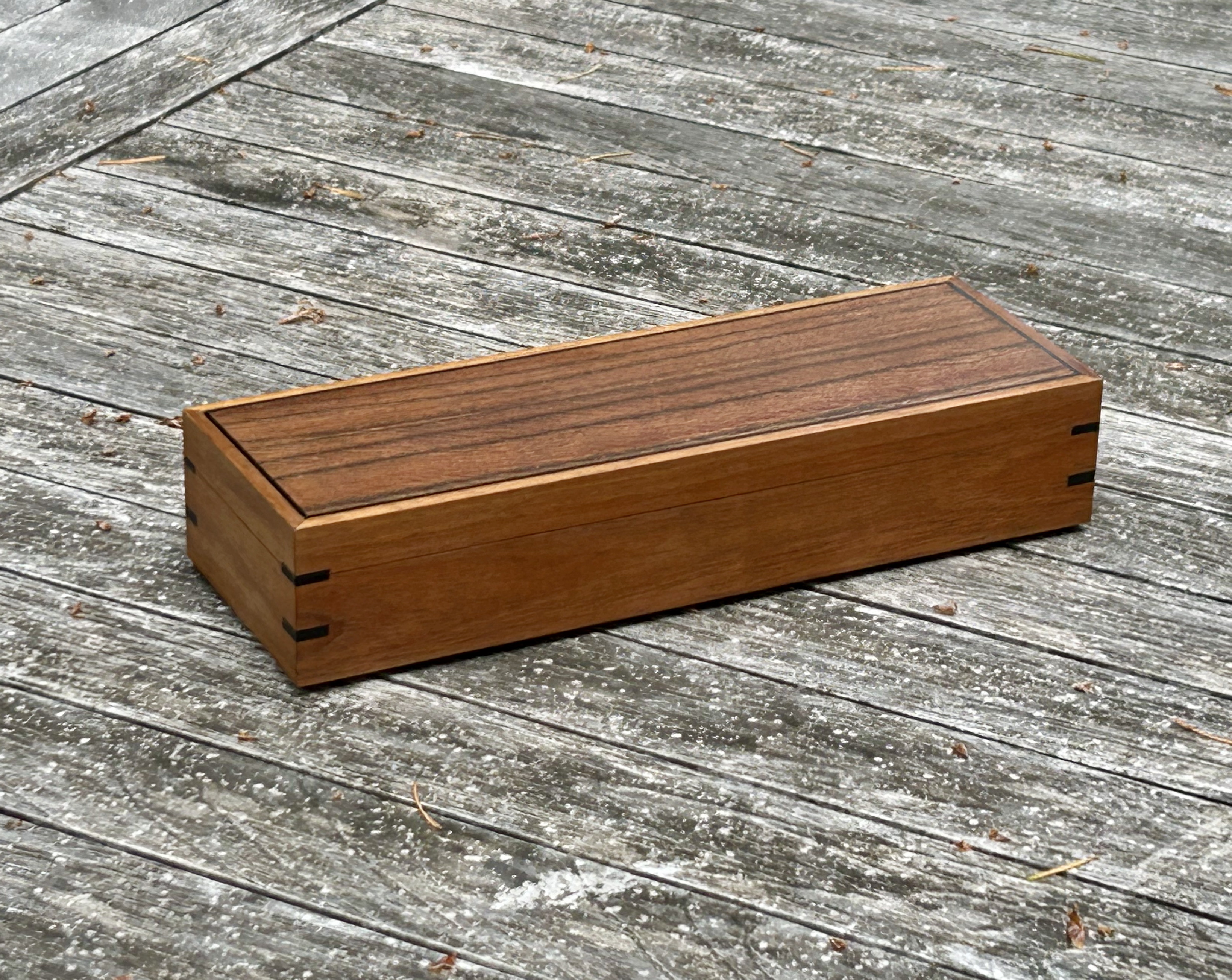 A solid koa carcass is topped with an Australian silky walnut veneered panel. The stringing and splines are ebony.