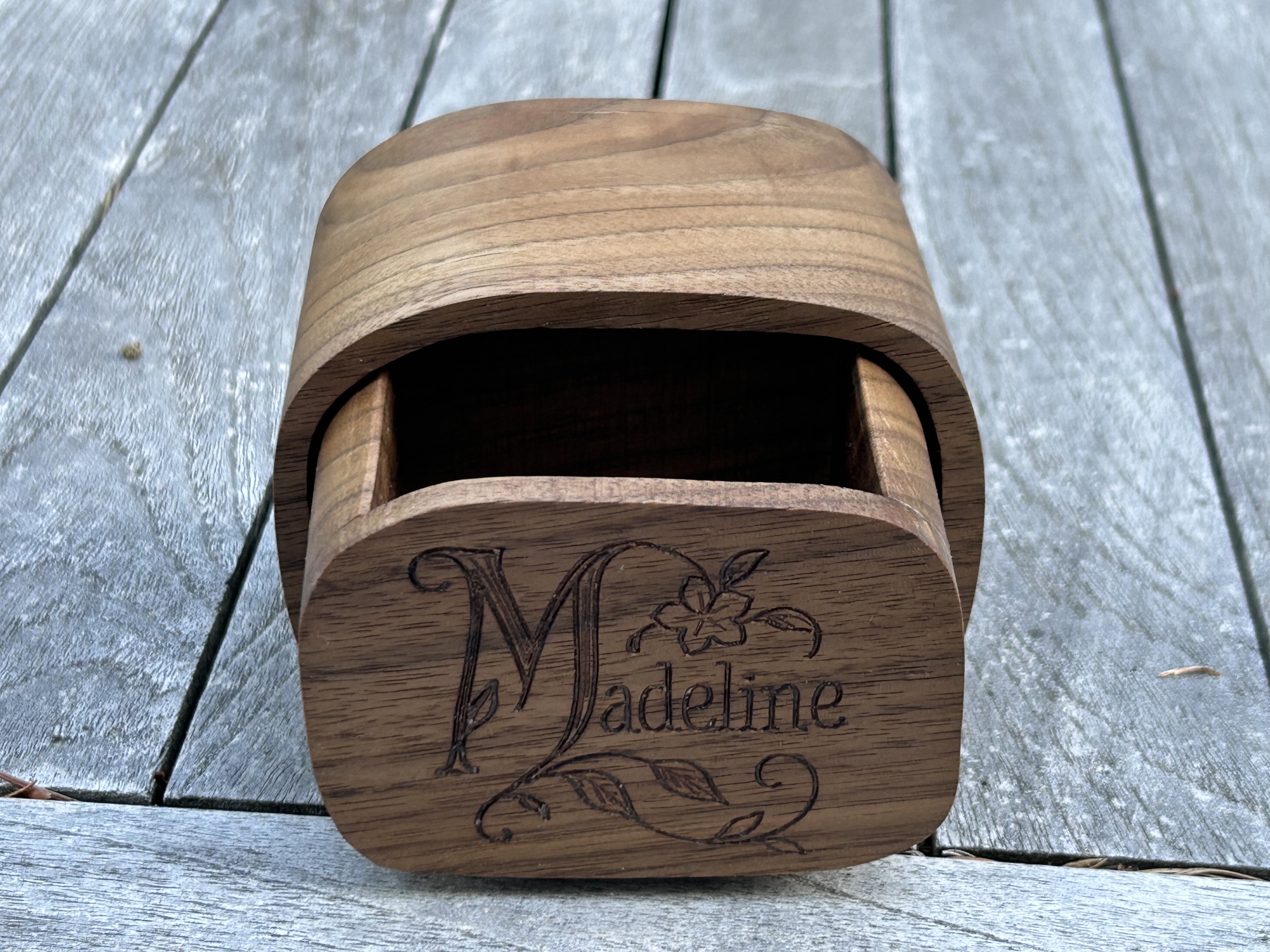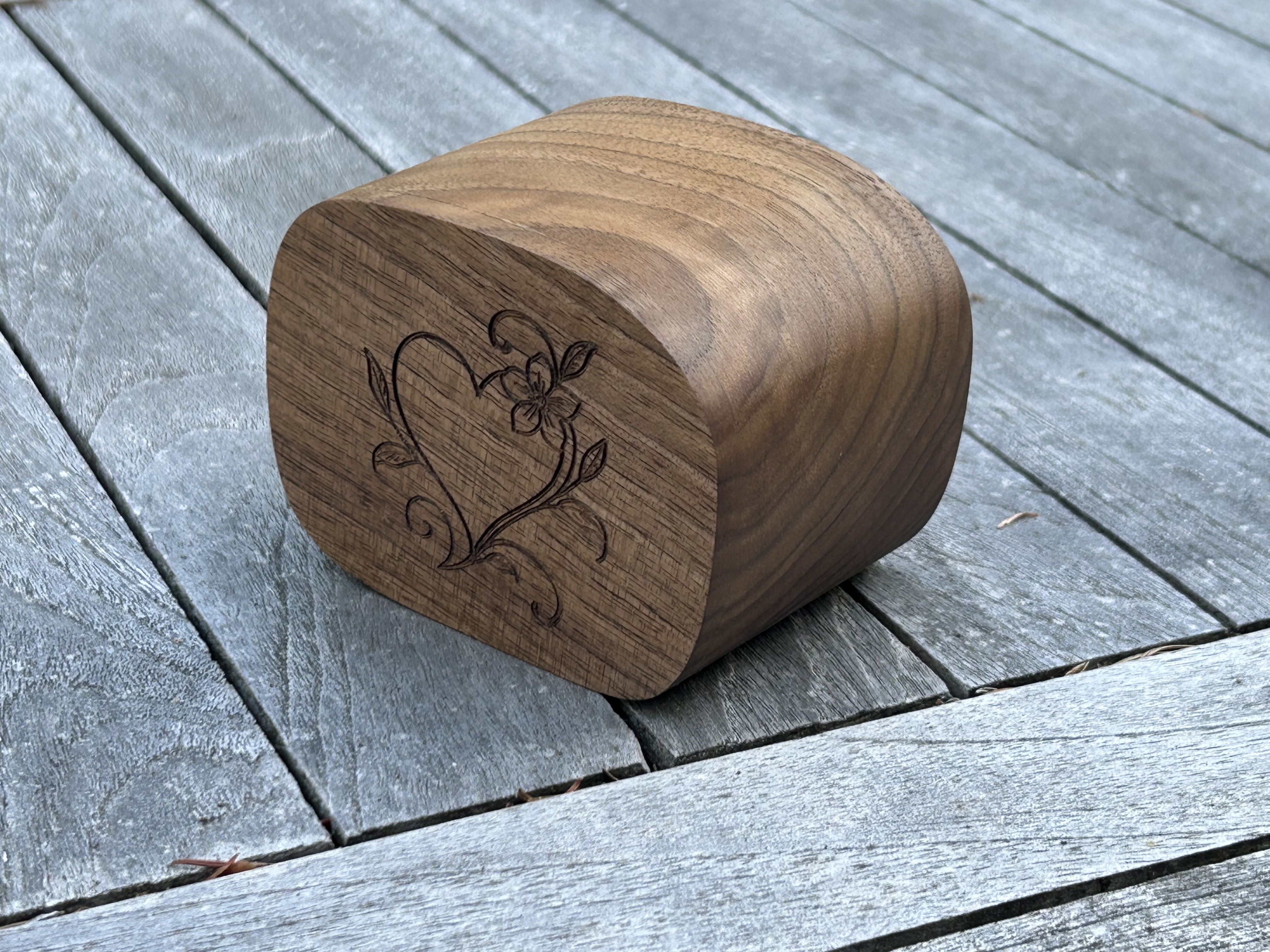 A structurally basic bandsawn box in walnut with personalized engraving in an art nouveaux style.