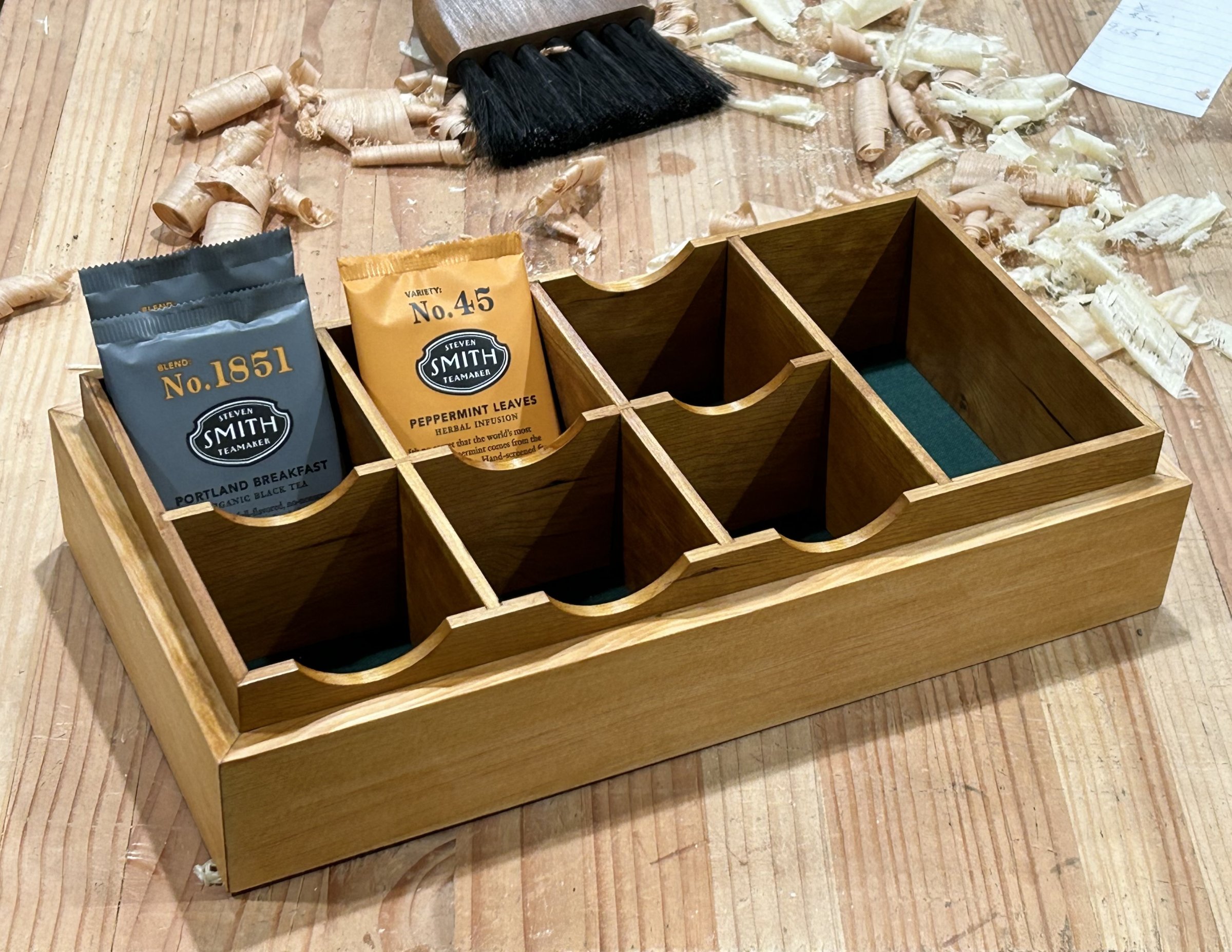 A box to hold tea bags and coffee supplies. The exterior is vertical grain fir, the interior liner is cherry. The bottom of the box is lined with green book cloth, which gives a bit of texture and prevents tea bags from sliding as much as they otherwise would. Finished with garnet shellac and a topcoat of wax.