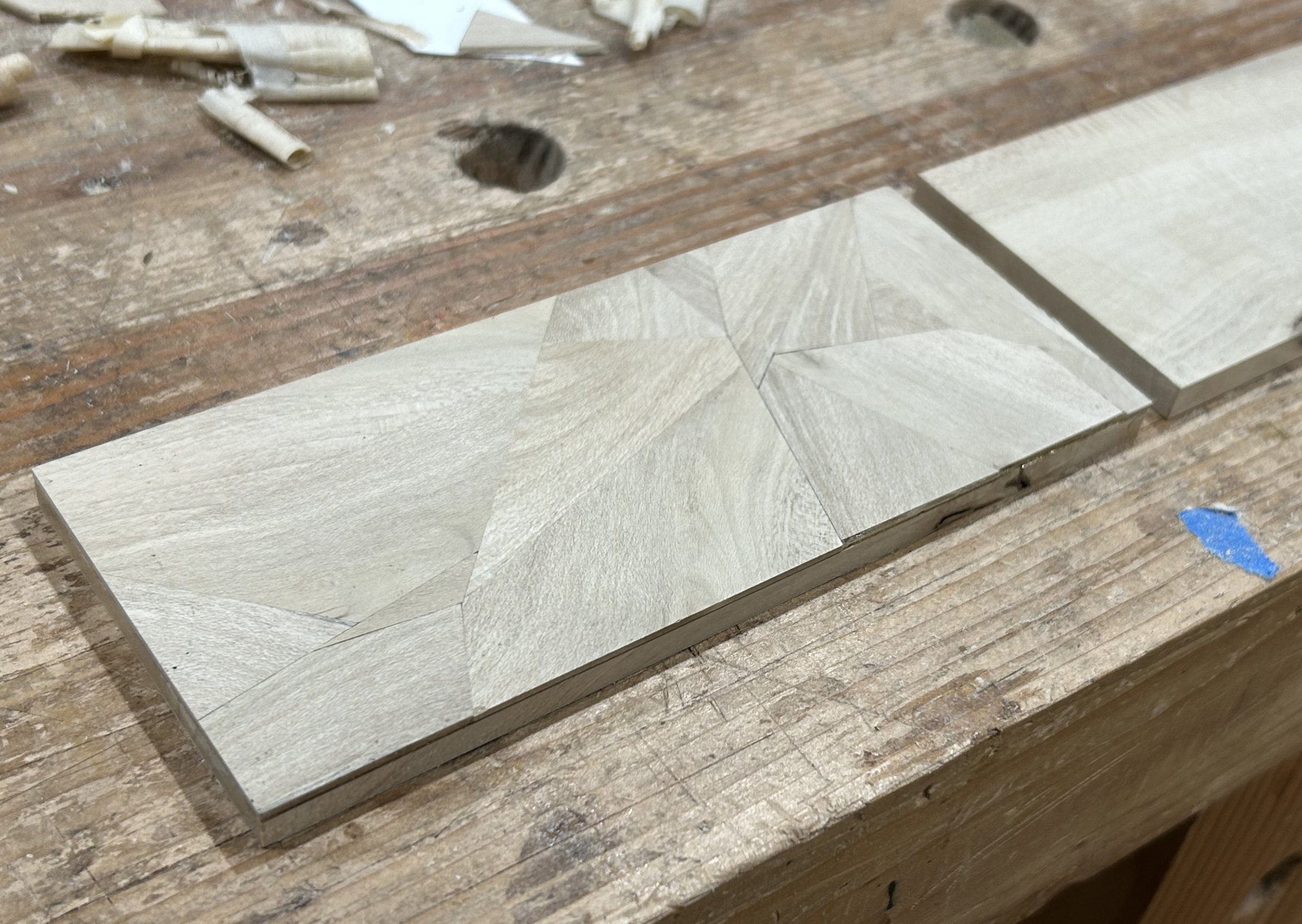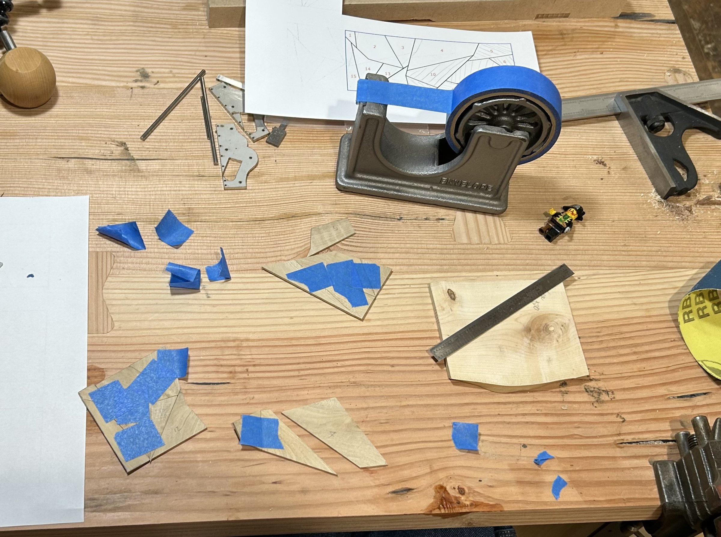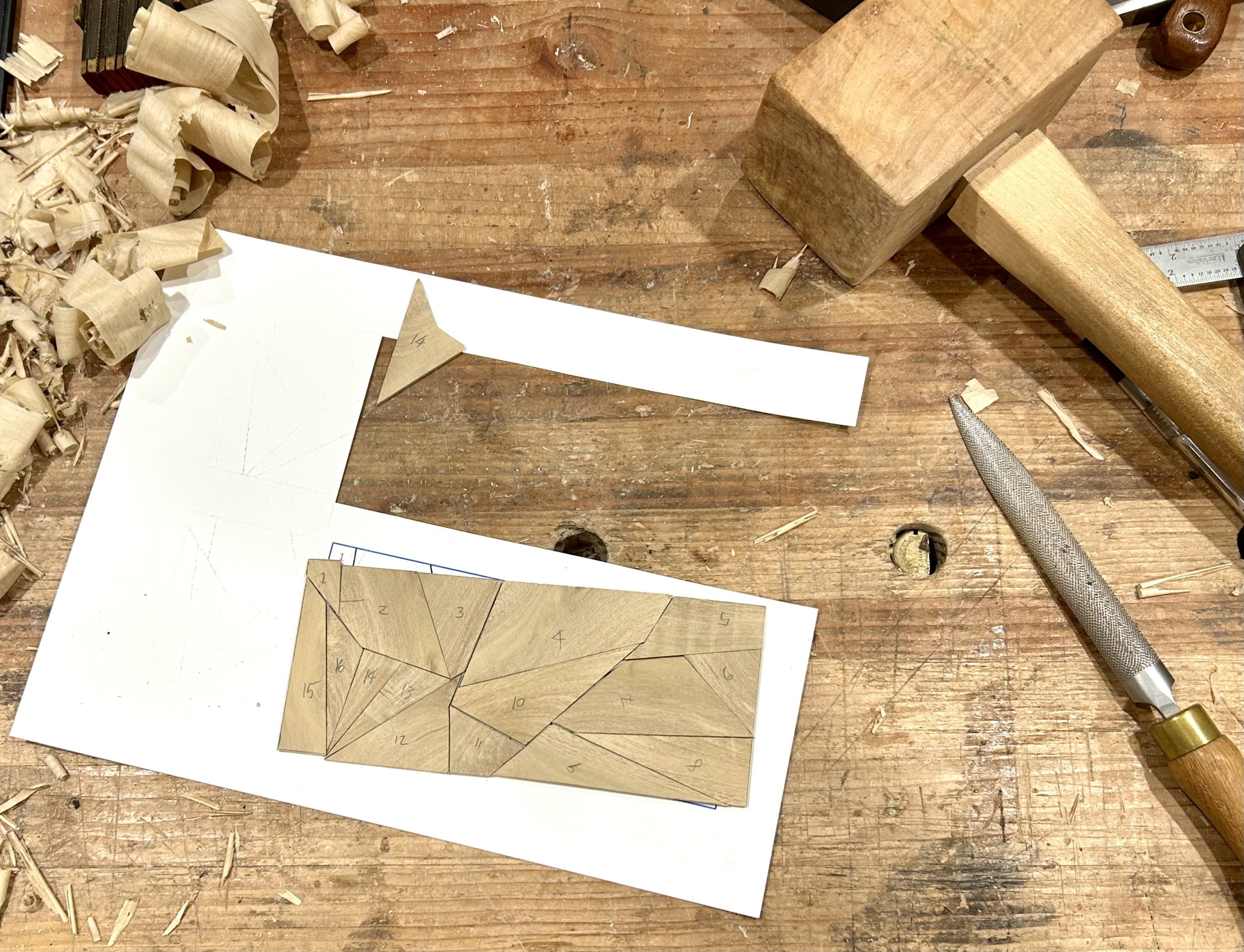 Cutting pieces for cracked ice front. Rough bandsaw; shot to final size. Chevalet next time for multiples? Consider reshaping 13/14/16 to avoid common point.