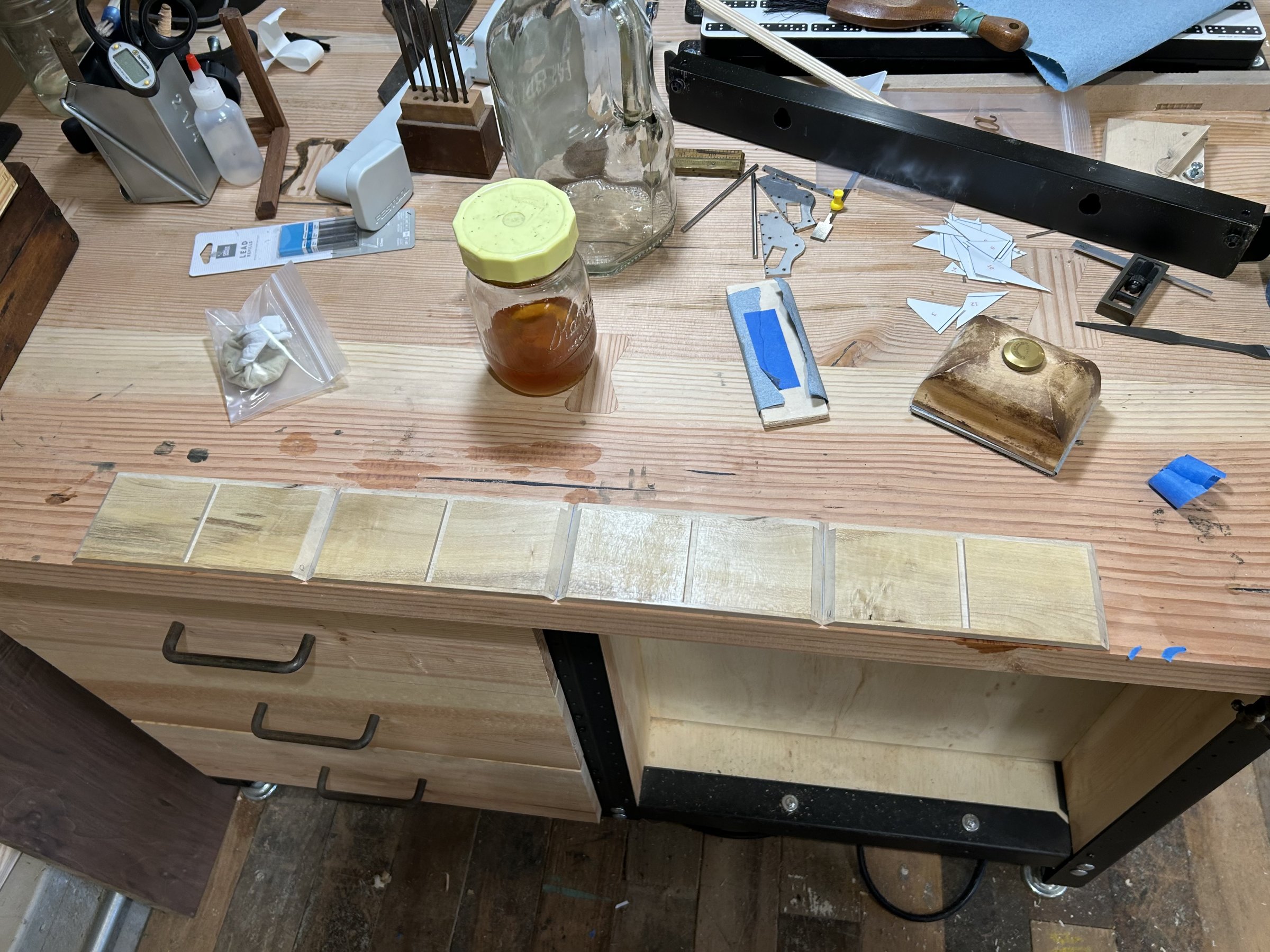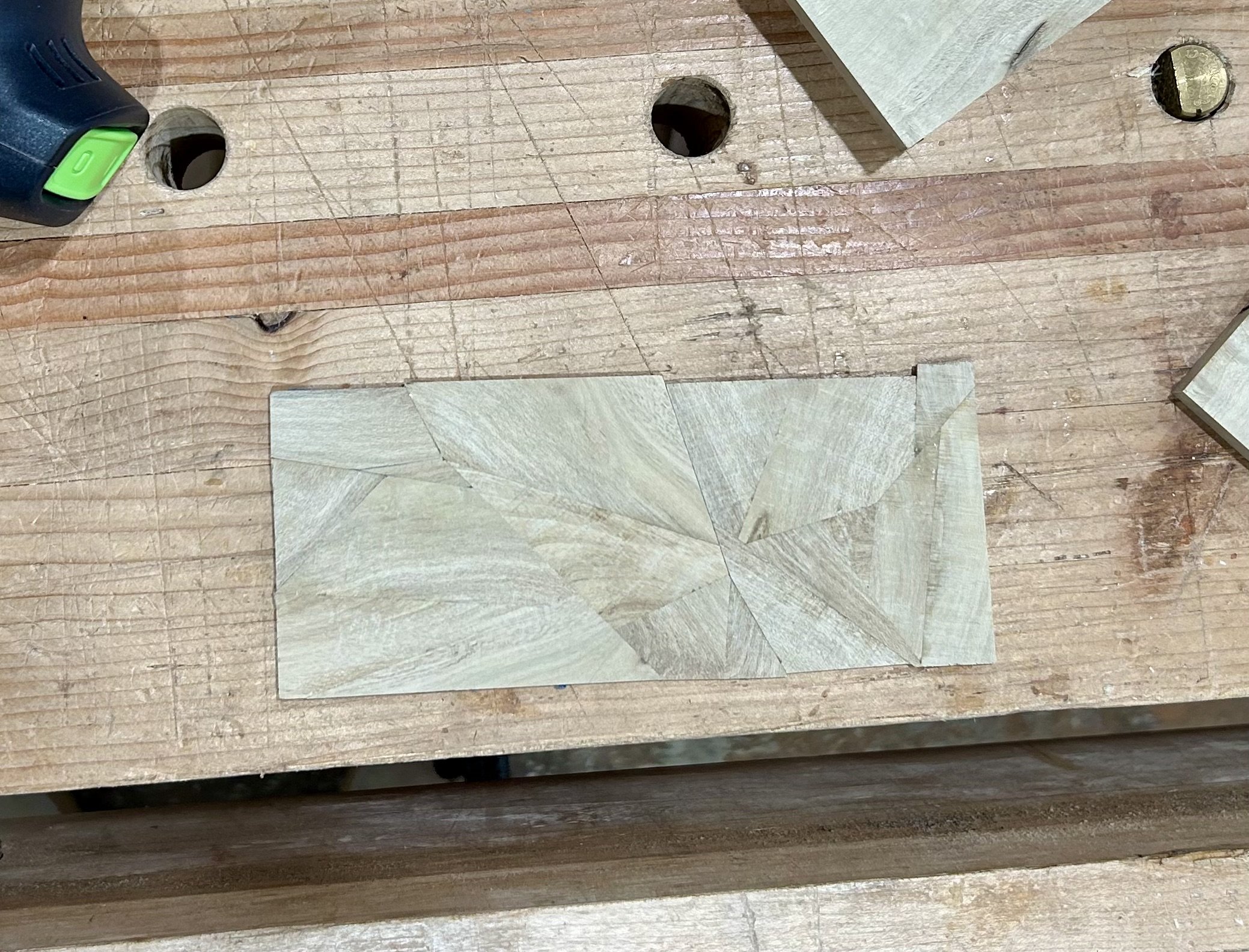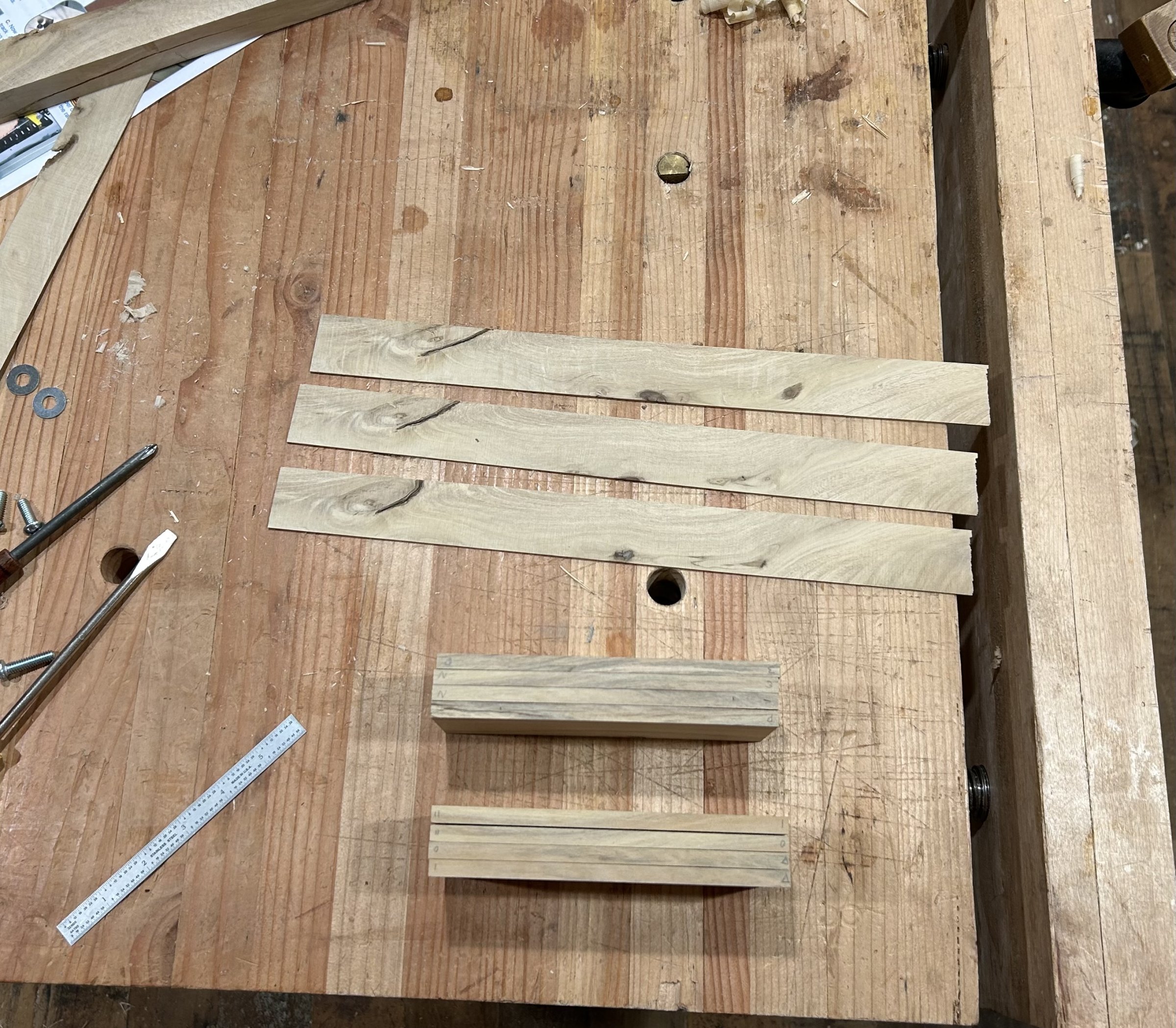 Cutting pieces for cracked ice front. Rough bandsaw; shot to final size. Chevalet next time for multiples? Consider reshaping 13/14/16 to avoid common point.