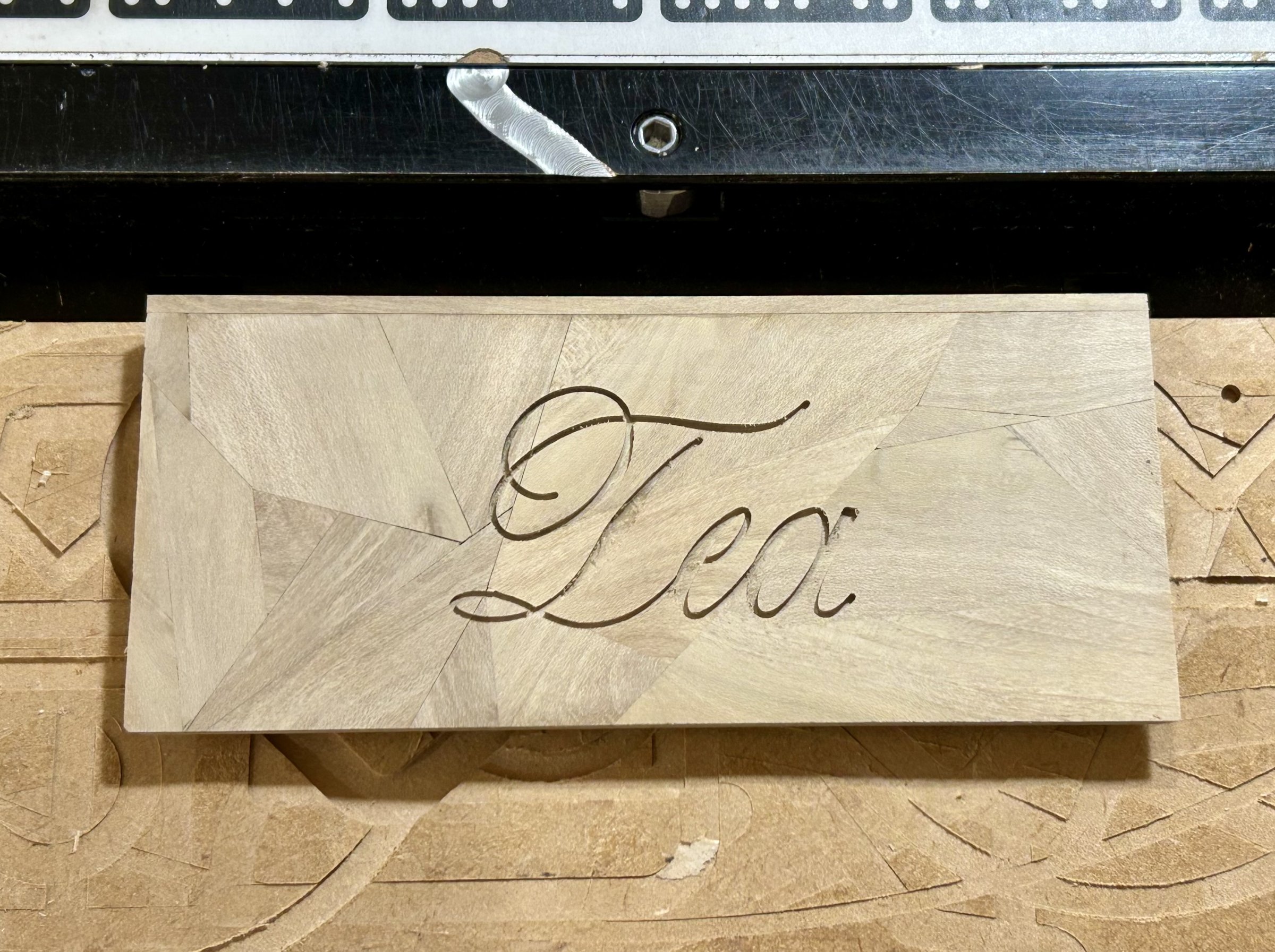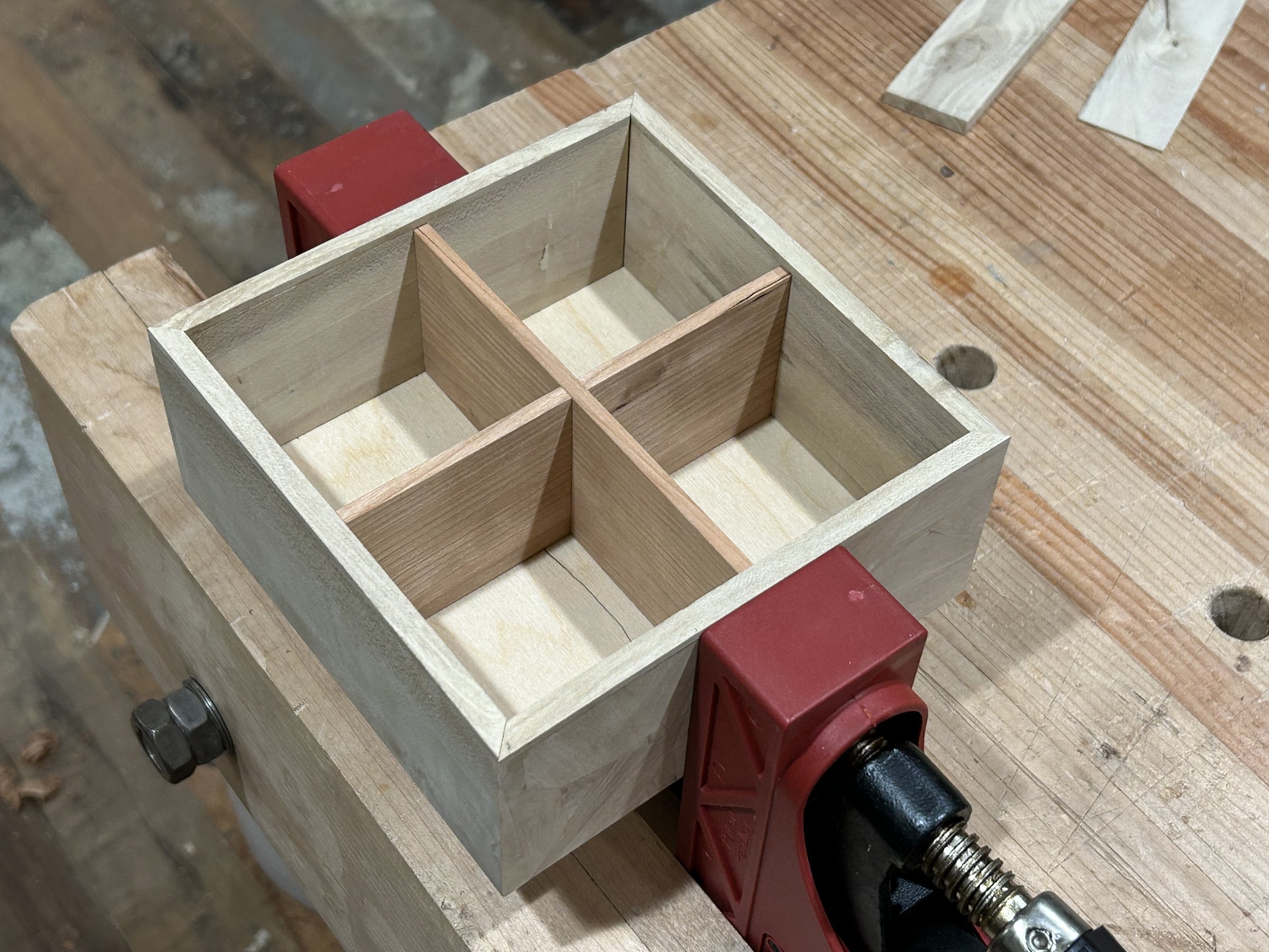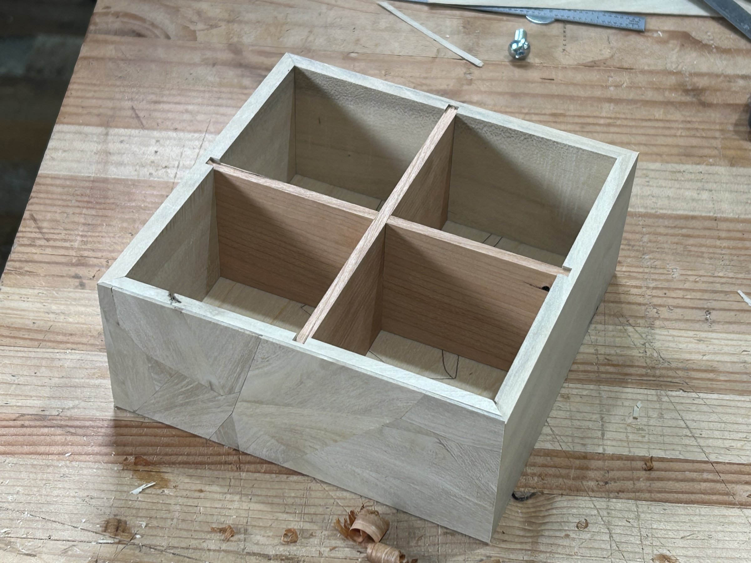 Prefinish cherry dividers; flush inside of holly sides; surface prep bottom; attach book cloth to bottom. |